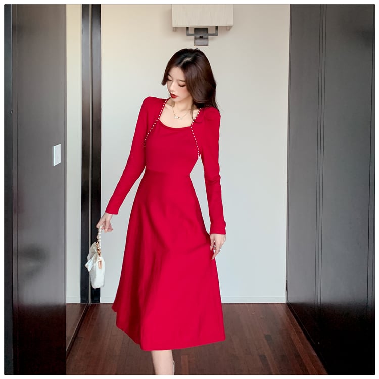 フレンチレトロニットボトミングドレスレディース秋冬コートデザインセンススクエアカラーロング膝丈セータースカート オータム 秋物 ウィンター 冬物 スクウェア yingd53615590346