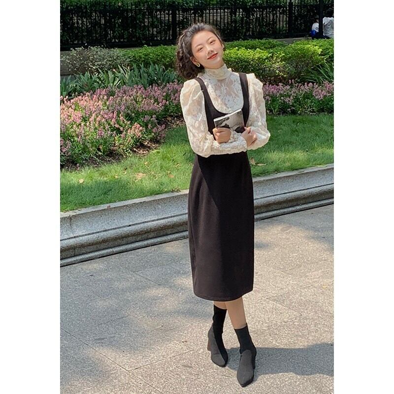 ウエスタンスタイルの年齢を減らすサスペンダースカートスーツ女性2021年秋冬香港スタイルのレトロシックなレースシャツドレスツーピースセット オータム 秋物 ウィンター 冬物 yingd36819216988