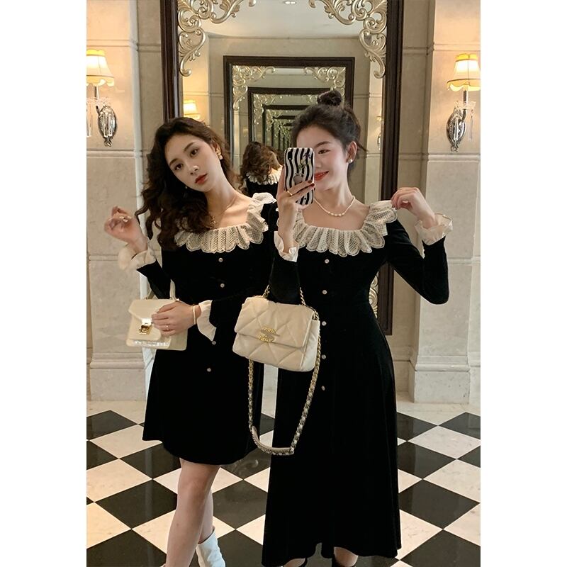フランスのレトロなヘップバーンスタイルのリトルブラックドレスシックなハイエンドロイヤルシスターライトおなじみのスタイルレーススクエアカラーベルベットドレス女性 スクウェア yingd42262345188