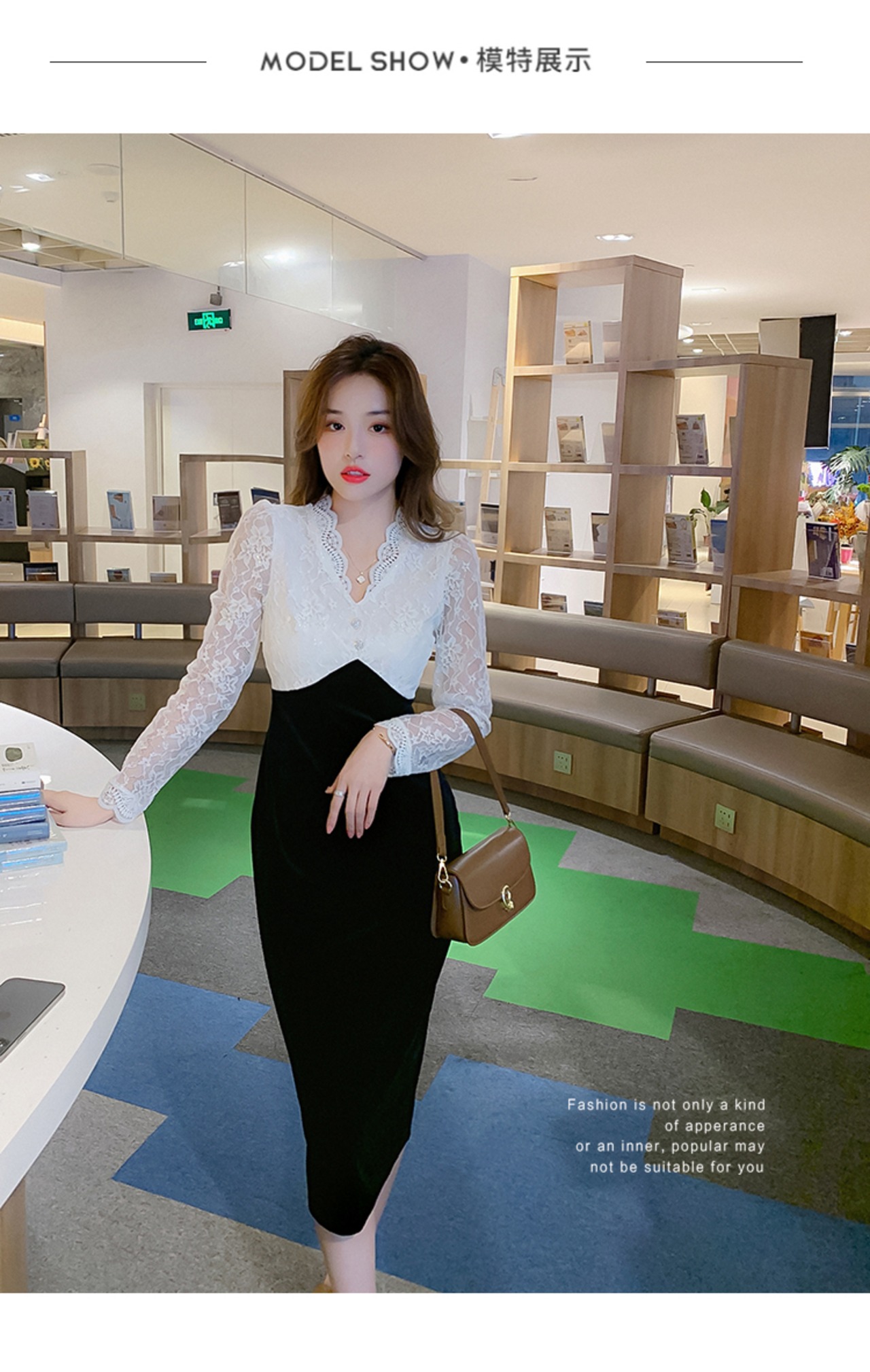 冷たい風の女性の高級感のある高級女性のスリムフィットと薄い気質の女神ファンレースステッチベルベットドレス yingd63752404053