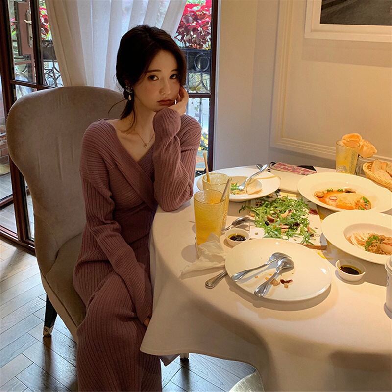 フレンチティーブレイクジェントルウィンドロング膝上セータードレススリムフィットスリムウエストVネックピンクニットドレス女性 yingd36777939225