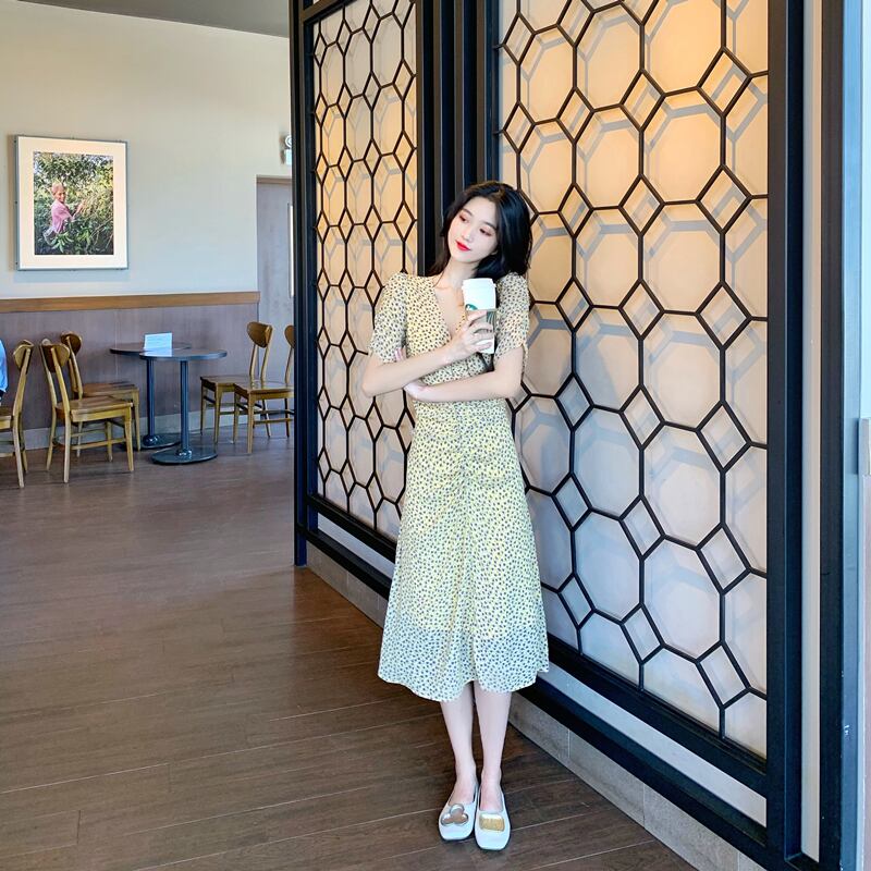 フランスのレトロなヘップバーン花柄ドレス女性の夏のドレス2020新しい気質Vネックウエストウエスト花柄ドレス サマー 夏物 yingd74674884470