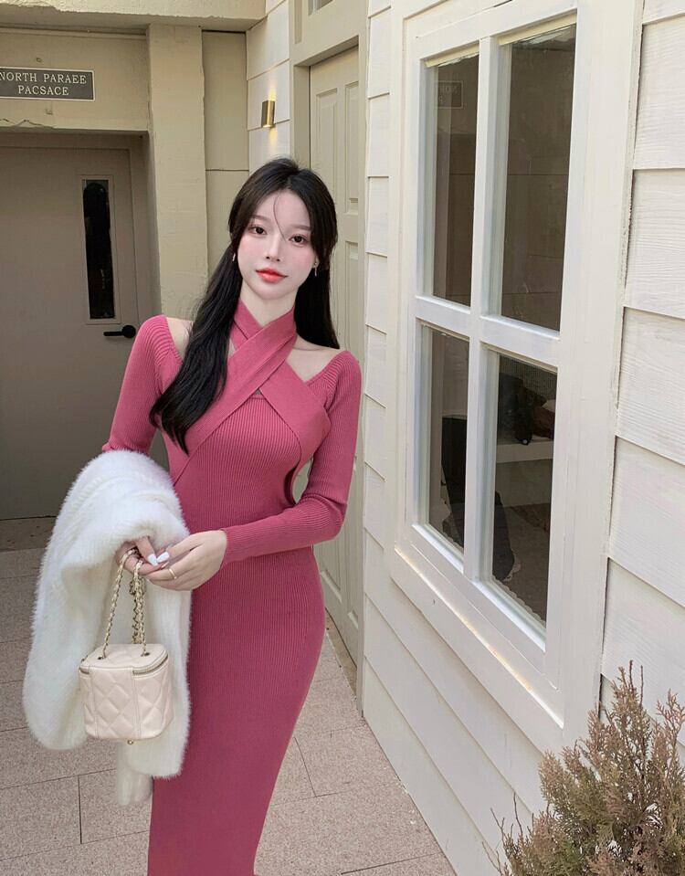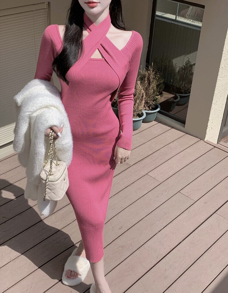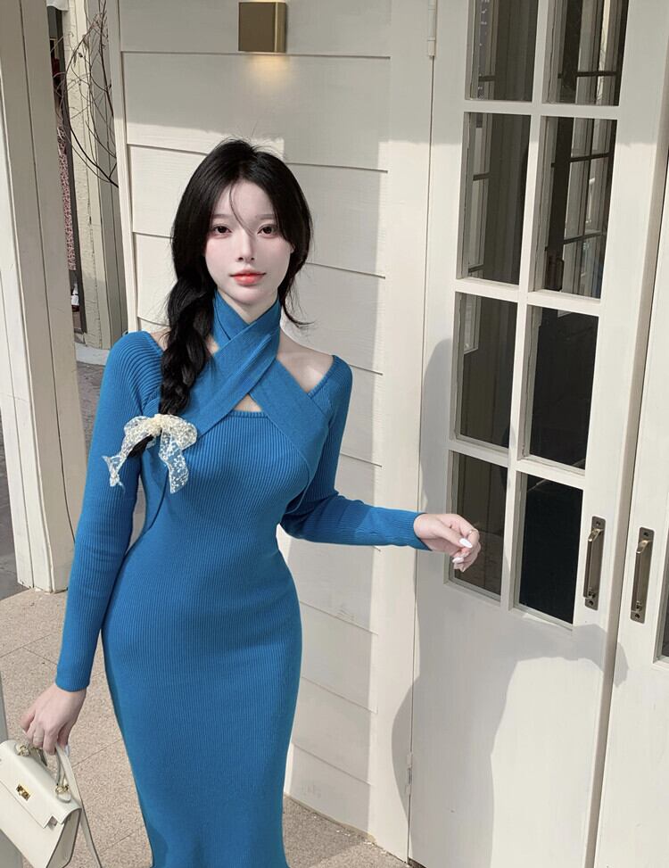 気質、女性らしさ、セクシー、タイトフィット、ヒップパックセーター、ドレス、スリムフィット、スリム、シックなデザイン、ホルターネックニットドレス yingd28087557176