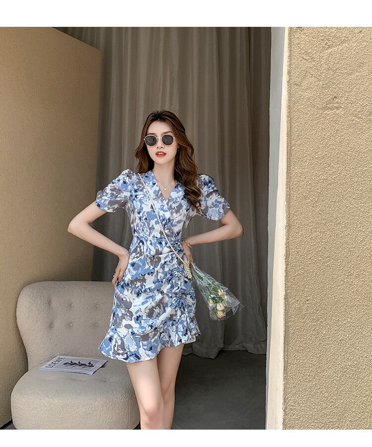 フランスのレトロな油絵モネスカートウエストスリム気質デザイン軽いおなじみのスタイルプリントフィッシュテールドレス女性の夏 サマー 夏物 yingd687457266