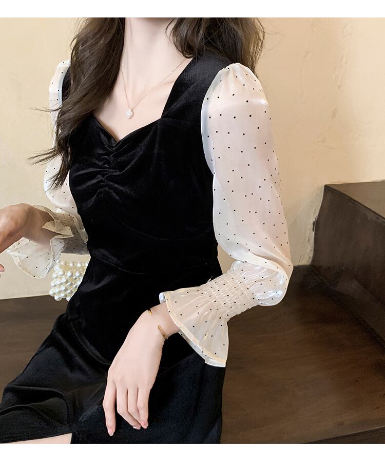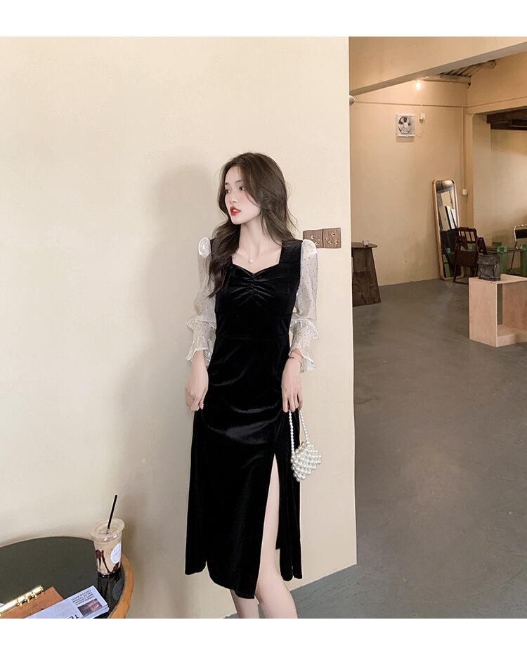 2021年秋新しい女性ヘップバーンフレンチドレスハイエンドライトラグジュアリーパフスリーブベルベットスリットロングスカート オータム 秋物 yingd18644210372