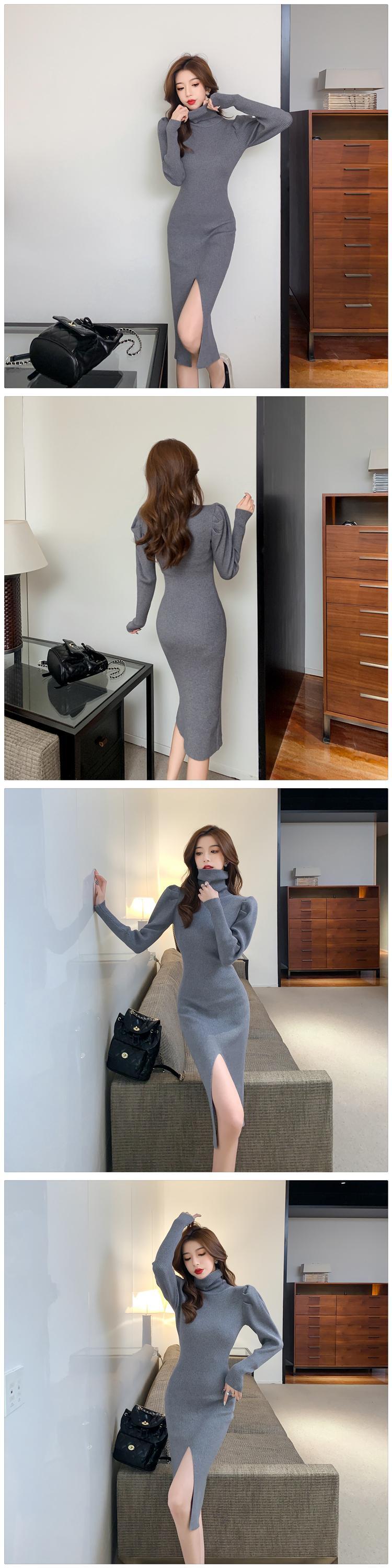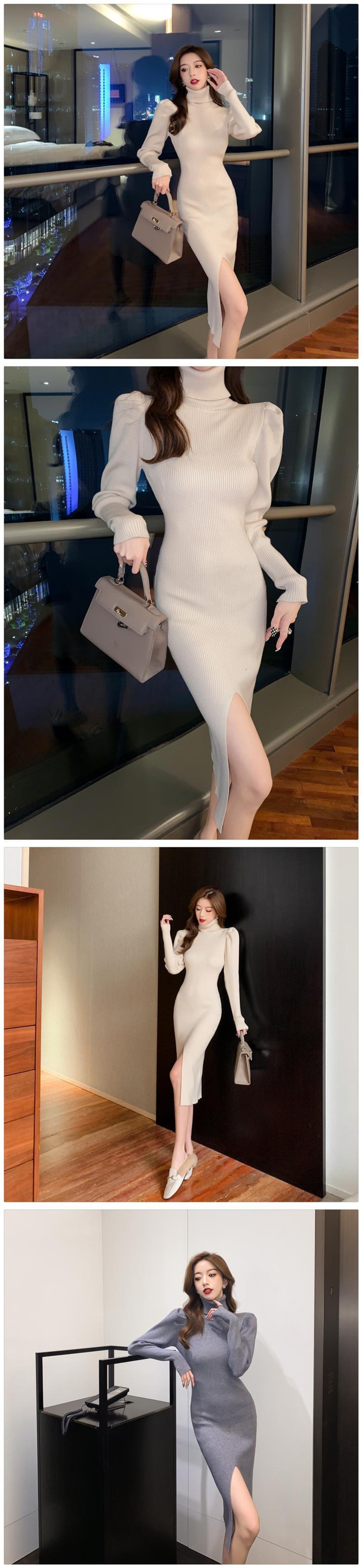 冬の厚みのある長い膝上セータードレススリムフィットとスリム気質優しい風スプリットパフスリーブニットドレス ロング ウィンター 冬物 yingd42571967092