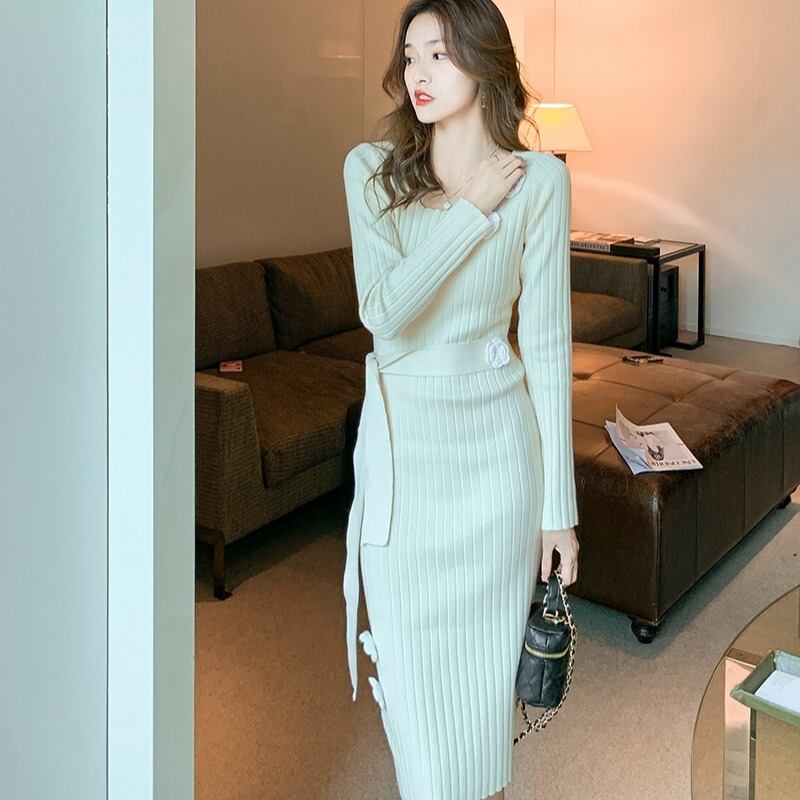 ロングオーバーザニーセータードレススリムフィットとスリム気質ミドル丈ピュアデザイスタイルスクエアネックニットドレスレディース秋冬 オータム 秋物 ウィンター 冬物 スクウェア yingd75511691361