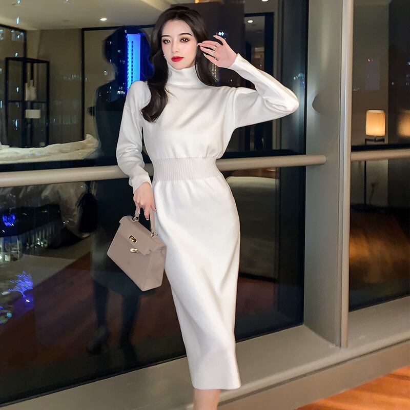 -首が太くなった長い膝上セータードレススリムフィットと薄い気質の優しい風ニットドレス秋と冬の女性 ロング オータム 秋物 ウィンター 冬物 yingd92937532399