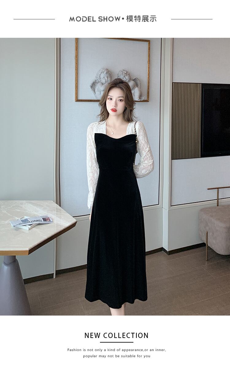 2021年秋新しいクールウィンドレディースハイエンドライトラグジュアリーセクシーなVネックレースステッチベルベットドレス オータム 秋物 yingd12936950423