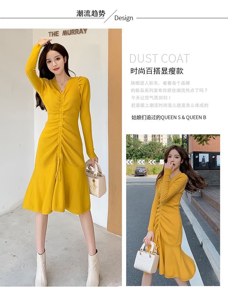 フランスのレトロシックなデザインセンスニッチ巾着Vネックウエストスリミング気質スリムニットワンピース秋冬 オータム 秋物 ウィンター 冬物 yingd91055942039