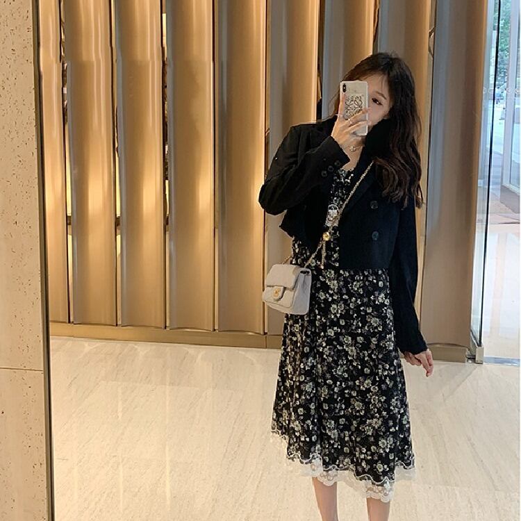春物2021年新作フレンチレトロウエストウエストショー薄手の気質セクシーVネックレースステッチフローラルドレス女性 スプリング 花柄 yingd61550055898