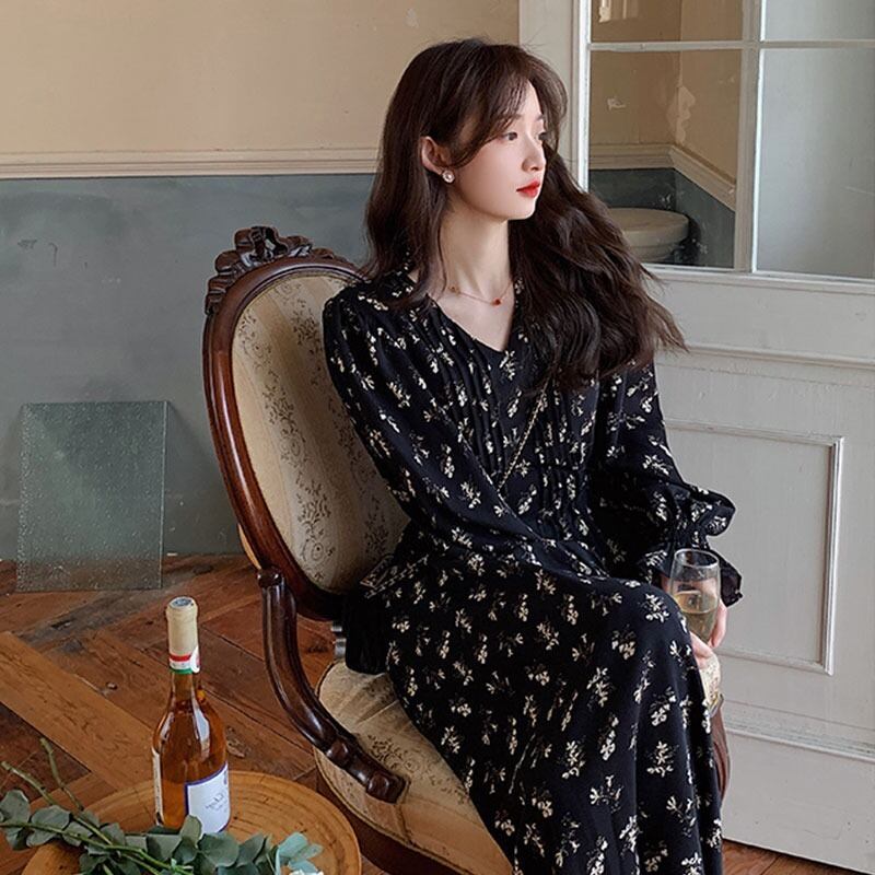 2021年初秋新しいフランスのレトロなヘップバーンスタイルの小さな黒いドレス、ウエストと膝の上の気質、花柄のドレスの女性 ブラック オータム 秋物 yingd84357925269