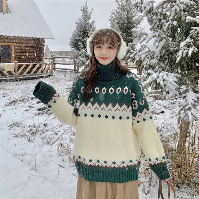 クリスマスタートルネックセーター女性の秋と冬のレトロなese怠惰なスタイルルーズで厚みのあるボトミングニットセータートップ オータム 秋物 ウィンター 冬物 yingd44411080509