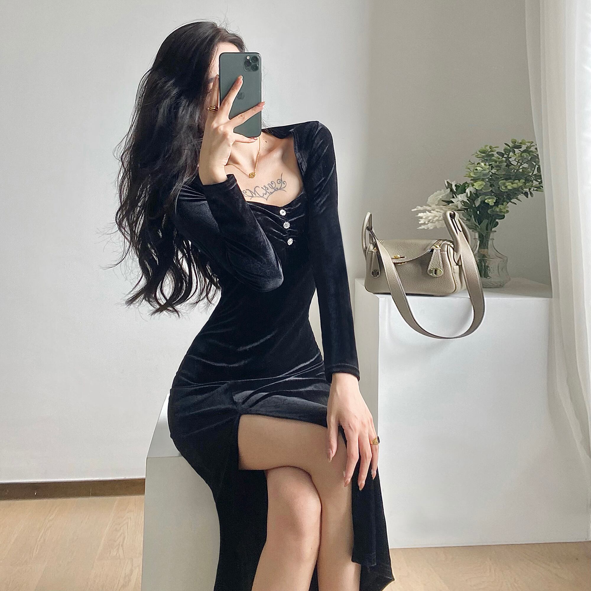 2021年秋新しいフランスのレトロな純粋な欲望風スリムスリムプリーツセクシーなスプリットサスペンダードレスの女性 オータム 秋物 ピュア yingd58822205323