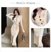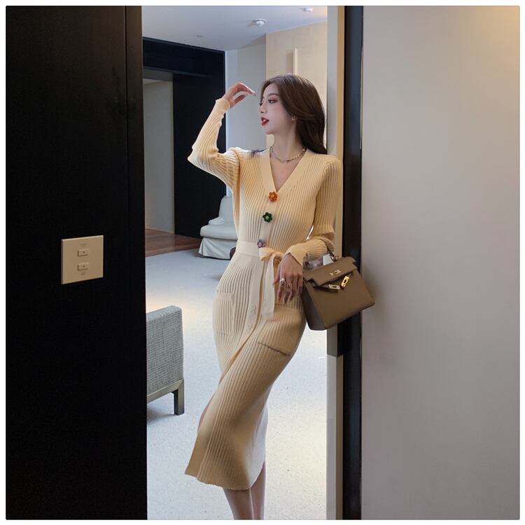 フランスのレトロな長い膝丈のセータードレスウエストスリム気質Vネックニットドレス女性の秋と冬 ロング オータム 秋物 ウィンター 冬物 yingd96008111369