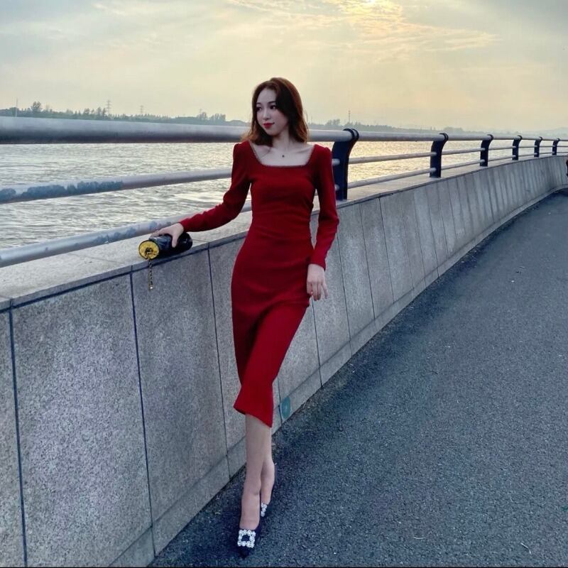 フランスのレトロなヘップバーンスタイルのドレス、ウエストと薄い気質のハイエンドライトラグジュアリースクエアカラーバッグヒップドレス女性の秋と冬 オータム 秋物 ウィンター 冬物 スクウェア yingd3639352380