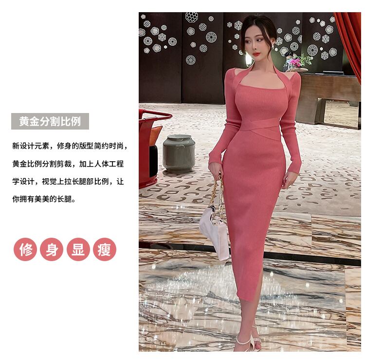 シックなハイエンド気質セータードレスミドル丈スリムフィットセクシーなスプリットヒップニットドレス yingd37099765266