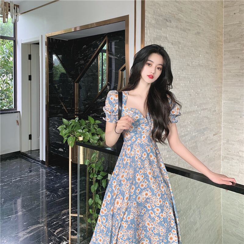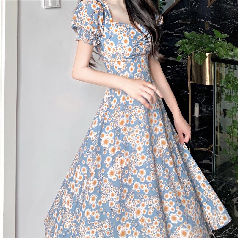 フランスのレトロなスクエアネックパフスリーブフローラルドレスレディースサマードレス2021新しい優しい風フローラルミドルスカート 夏物 花柄 スクウェア yingd99926506494