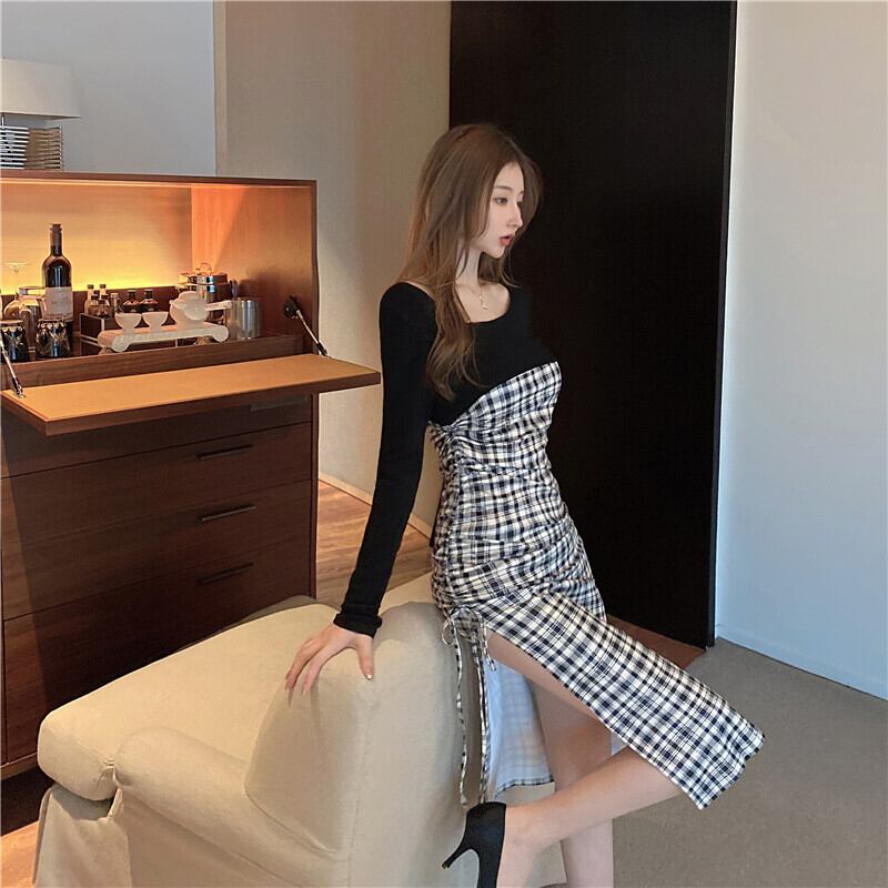 2021年秋新しい涼しい風の婦人服ハイエンドライトラグジュアリーデザインプリーツ巾着スリットドレス女性 オータム 秋物 yingd85308920011