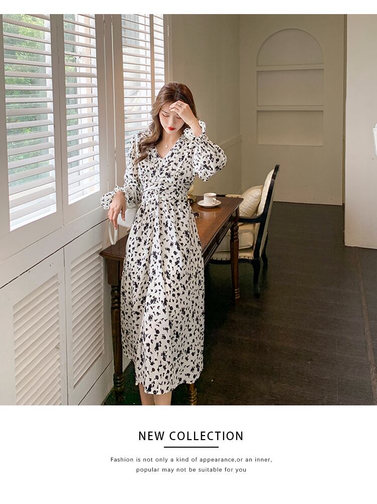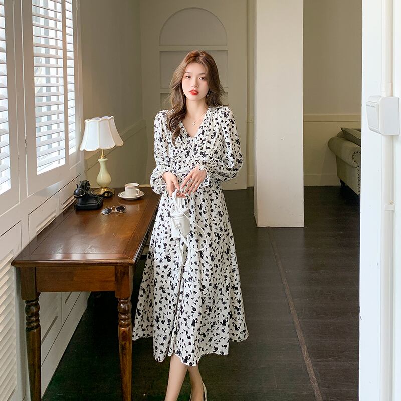 フランスのニッチな優しいスタイルのティーブレイクベルフラワースカートウエストは細くて気質の長い妖精の花柄のドレス女性初秋 ロング オータム 秋物 フラワーデザイン yingd15709518554