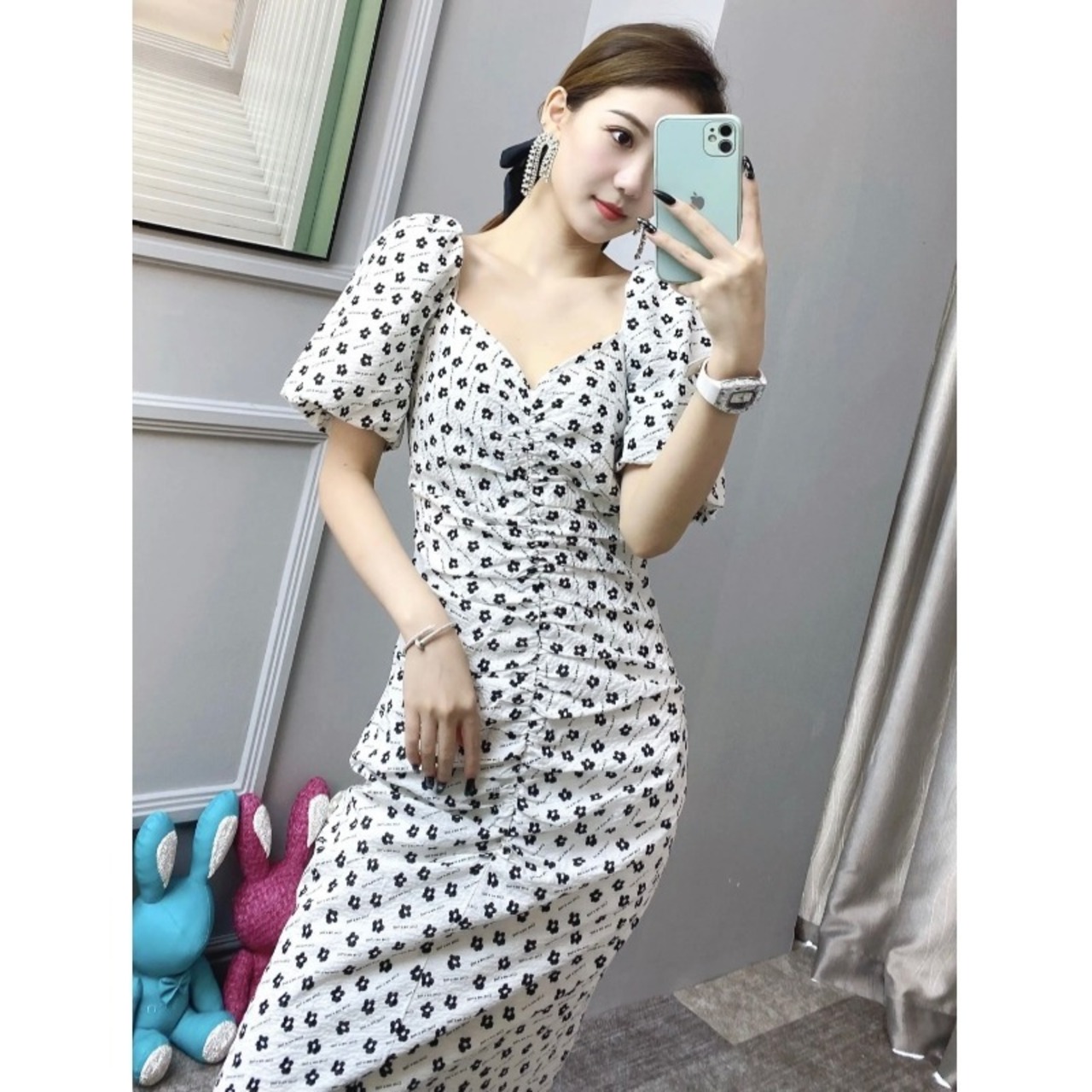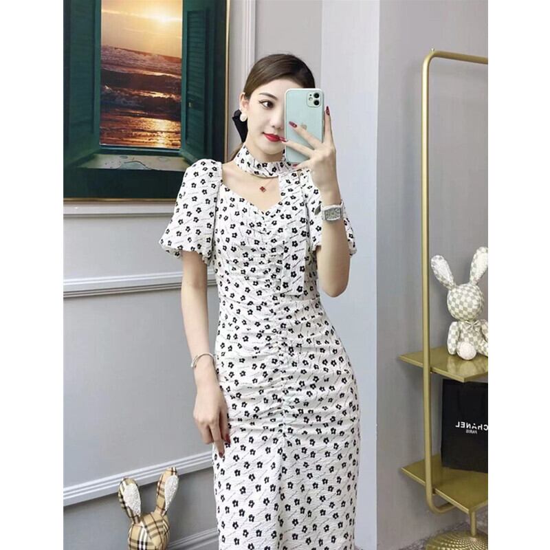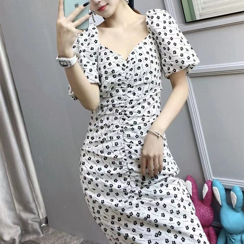 フランスのレトロなデザインのハイエンドスカートウエストスリム気質スクエアネックパフスリーブ水玉スリットドレス夏 サマー 夏物 スクウェア yingd33968666909