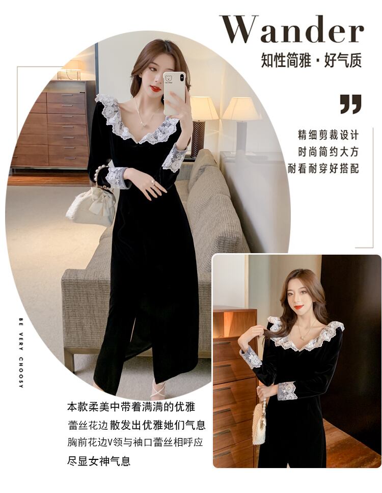 極寒の風の女性のハイエンドな光の高級感レディースウエストスリム気質セクシーなスプリットベルベットドレス女性の秋と冬 オータム 秋物 ウィンター 冬物 yingd52375730361