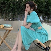 フランスのレトロなロイヤルシスターライトおなじみのスタイル高精細ライト高級レディースデザインセンスパフスリーブセクシーなウエストレスドレス女性の夏 サマー 夏物 yingd37123318555