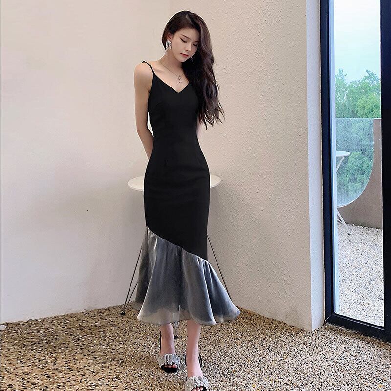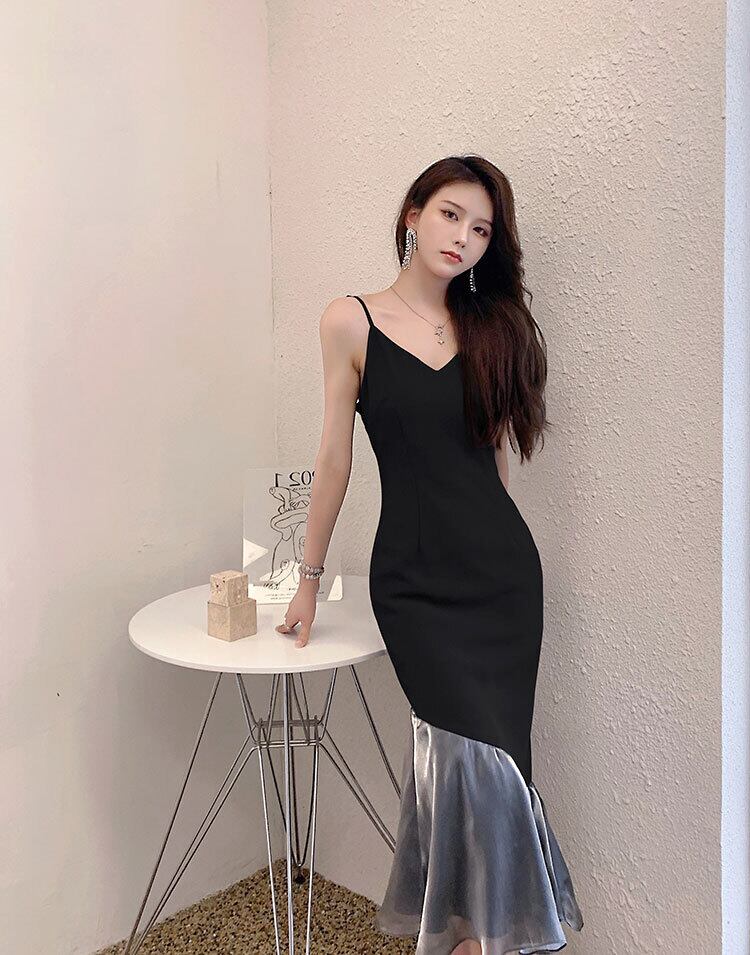 フランスのレトロな冷風ハイエンドスリングドレスウエストスリムメッシュステッチフィッシュテールスリングドレス夏 サマー 夏物 yingd46803279235