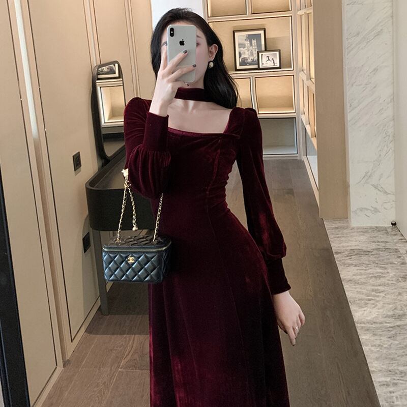 フレンチレトロコールドウィンドレディースハイエンドライトラグジュアリーレディースヘップバーンスタイルレッドホルターベルベットドレス秋冬 オータム 秋物 ウィンター 冬物 yingd74560664560