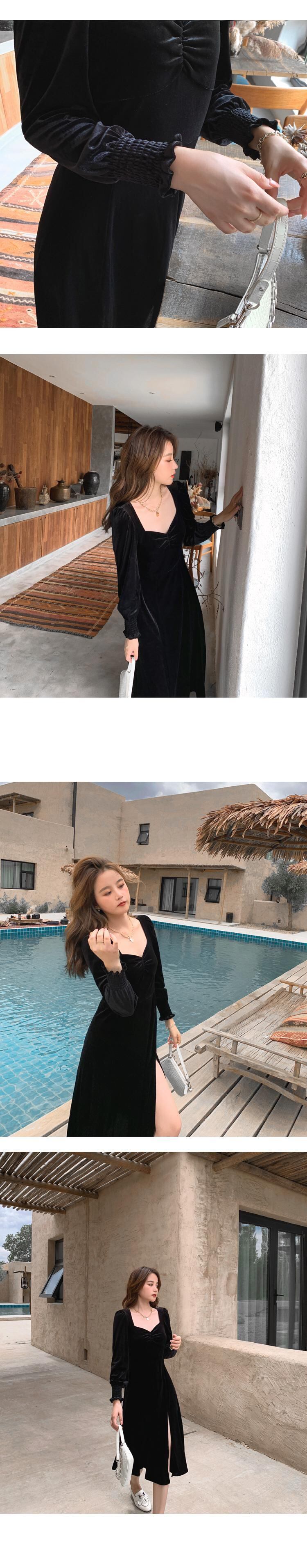 フランスのレトロなヘップバーンドレスは、薄くて高品質のスクエアカラーのベルベットスリット長袖ドレスの女性の秋と冬です ロング オータム 秋物 ウィンター 冬物 スクウェア yingd966599402