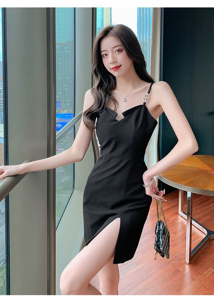 フランスのレトロシックなデザインのスカート夏のウエスト細い気質ヘップバーンスタイルの黒のスプリットサスペンダードレス ブラック サマー 夏物 yingd47073274071