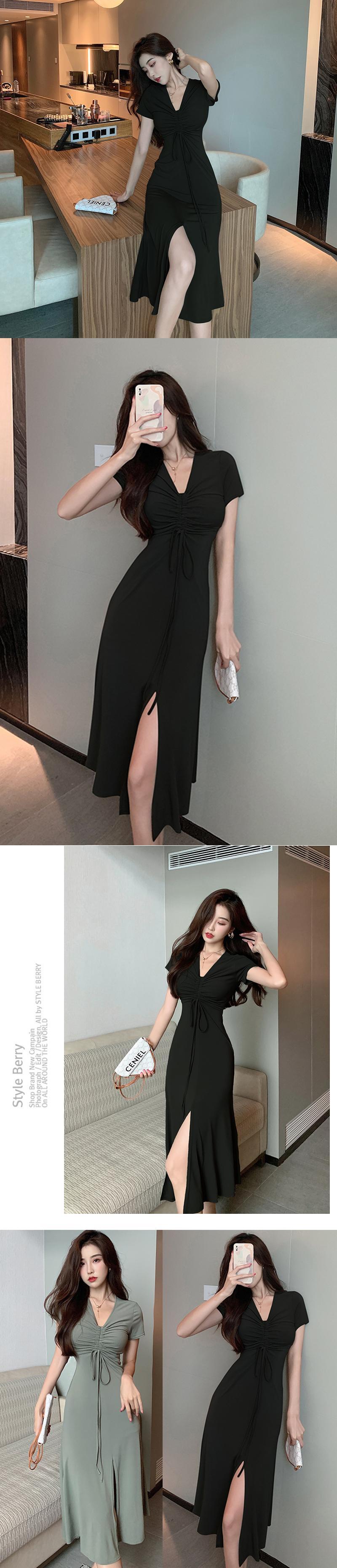 フランスのレトロシックなデザインのロングスカートスリムフィット、薄くて軽くて成熟したVネック巾着スリットドレス夏の爆発スタイル サマー 夏物 yingd70520172683