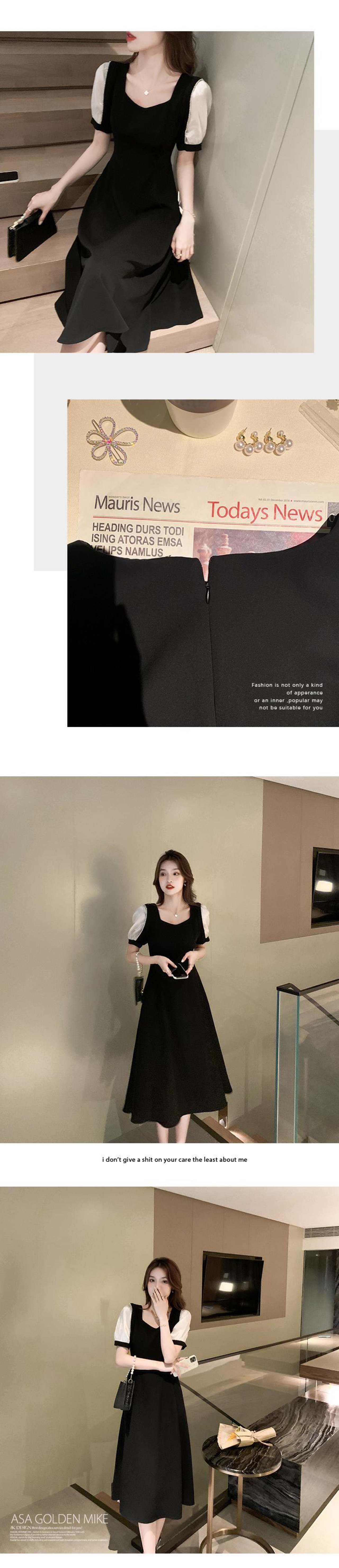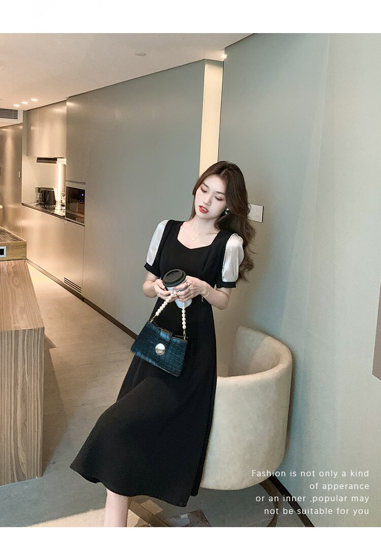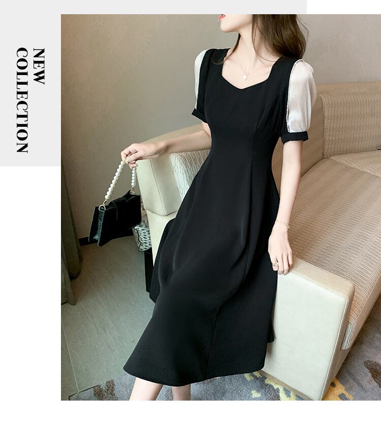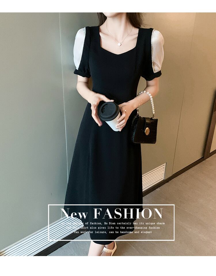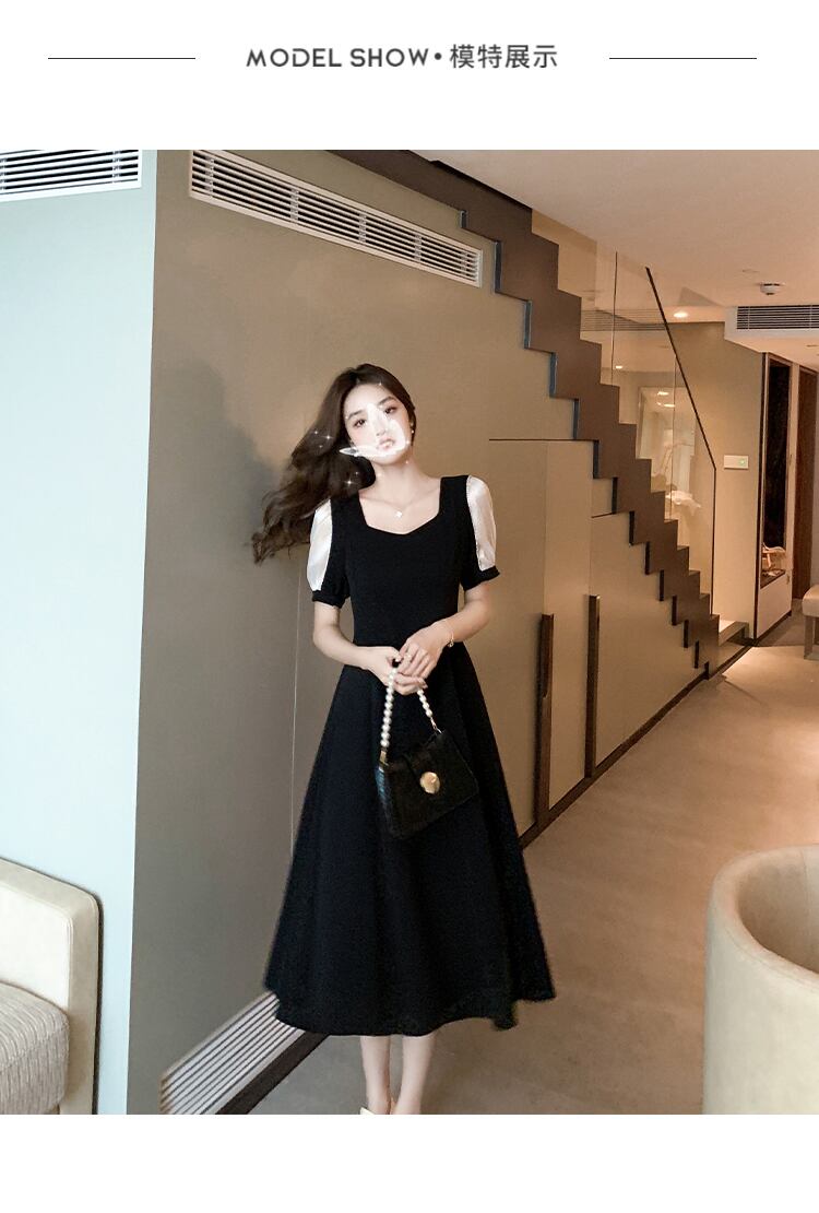 フレンチレトロニッチオーバーザニーロングスカートウエストシックなデザインセンスヘップバーンスタイルブラックスクエアカラードレス女性夏 サマー 夏物 スクウェア yingd5757257441
