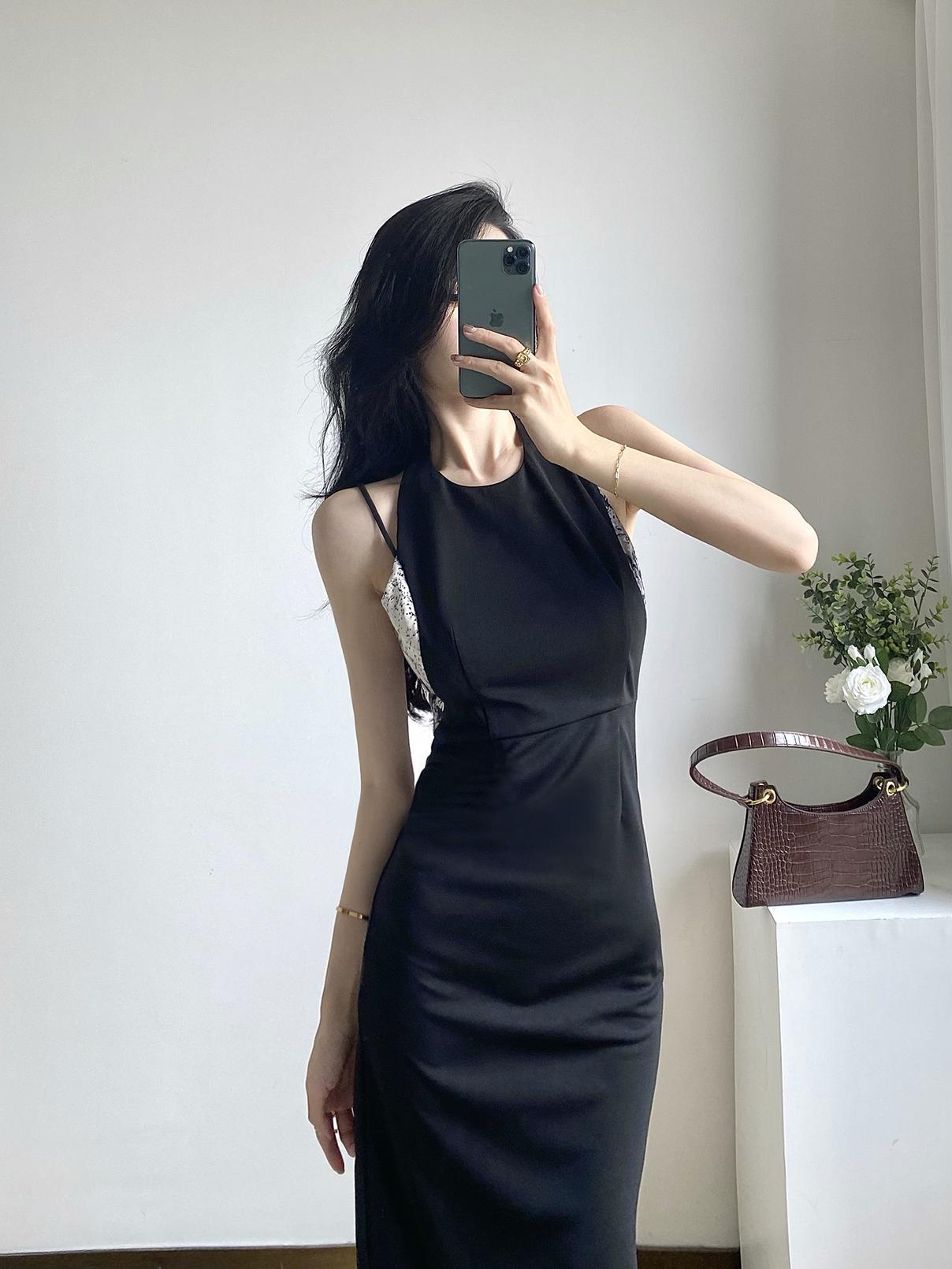 フランスのレトロなセクシーなサスペンダードレススリムフィットとスリムなデザインのステッチバックレスホルターサスペンダードレス女性の夏 サマー 夏物 yingd38672744599
