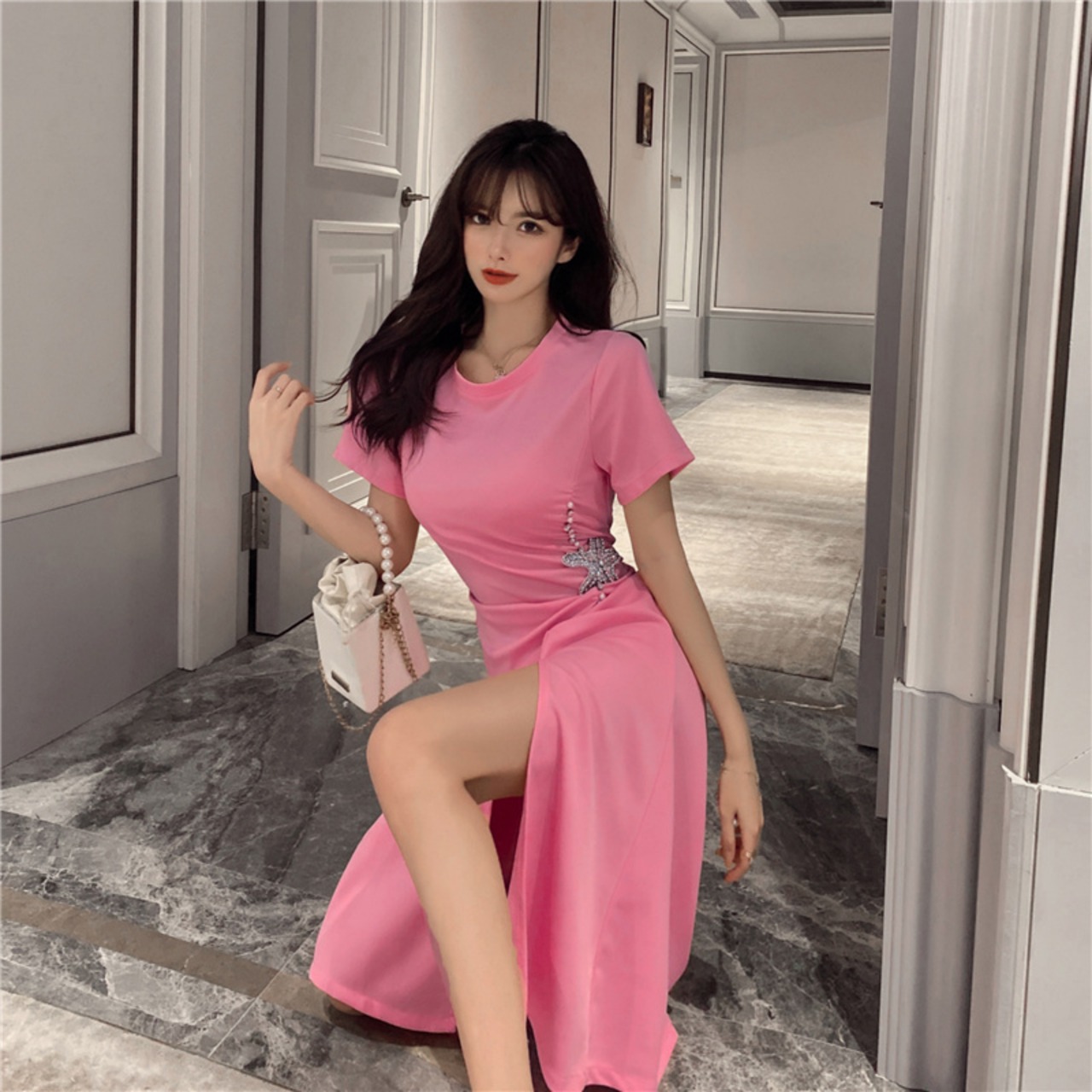 フランスのレトロシックなデザインのスカートスリムフィットと薄い気質セクシーなスプリットライト高級重工業ドレス女性の夏 サマー 夏物 yingd80422978573