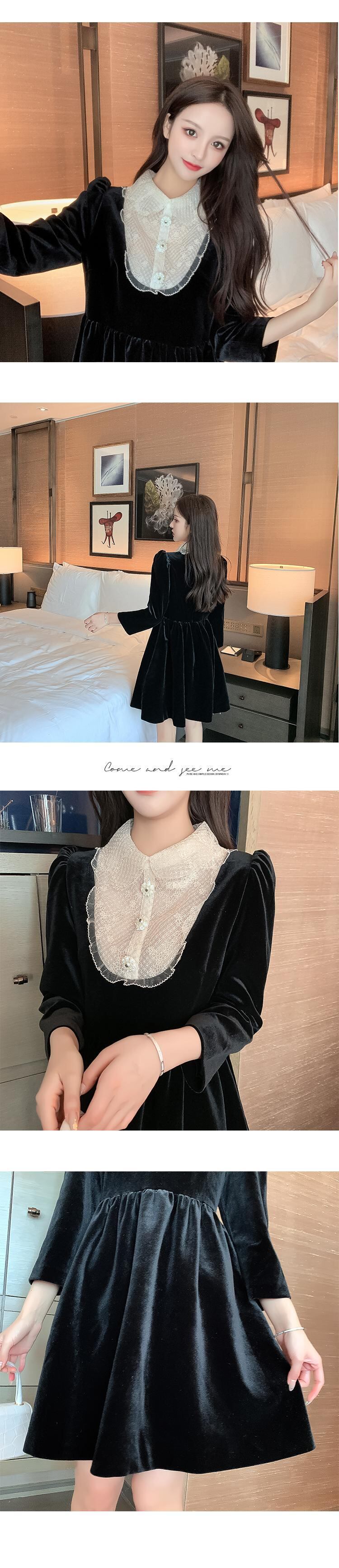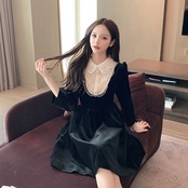 フレンチレトロヘップバーンスタイルのウエストと薄い気質の小さな黒いドレスライトラグジュアリーレディースステッチベルベットドレス女性の秋と冬 ブラック オータム 秋物 ウィンター 冬物 yingd55975548926