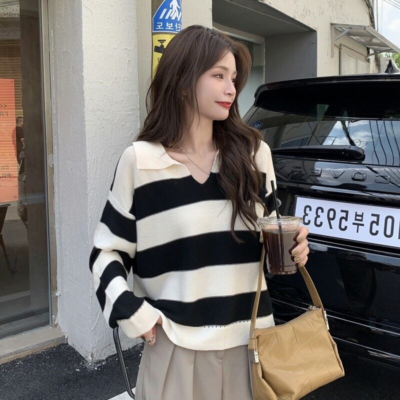 黒と白のストライプのセーター女性のルーズアウター2021初秋レトロルーズで怠惰な風プルオーバーセータートップ ホワイト ブラック オータム 秋物 yingd18170519384