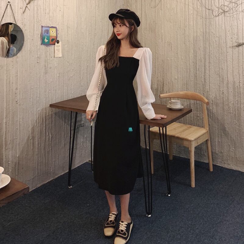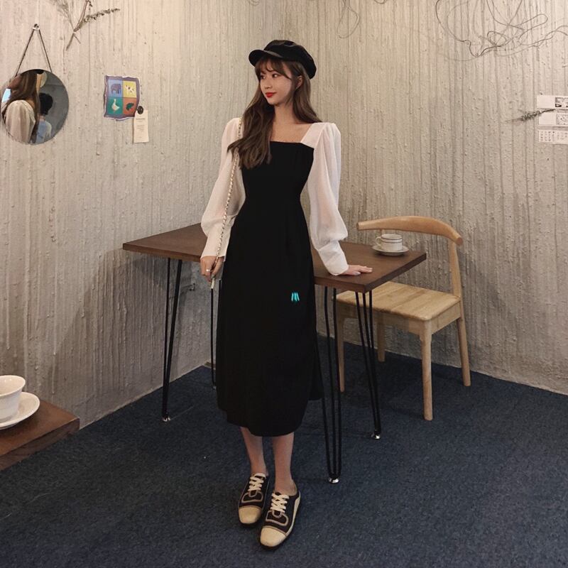 2020年秋新作レディースフレンチレトロスクエアカラーウエストスリム気質女神ファン長袖黒ドレス ロング ブラック オータム 秋物 スクウェア yingd13916783426