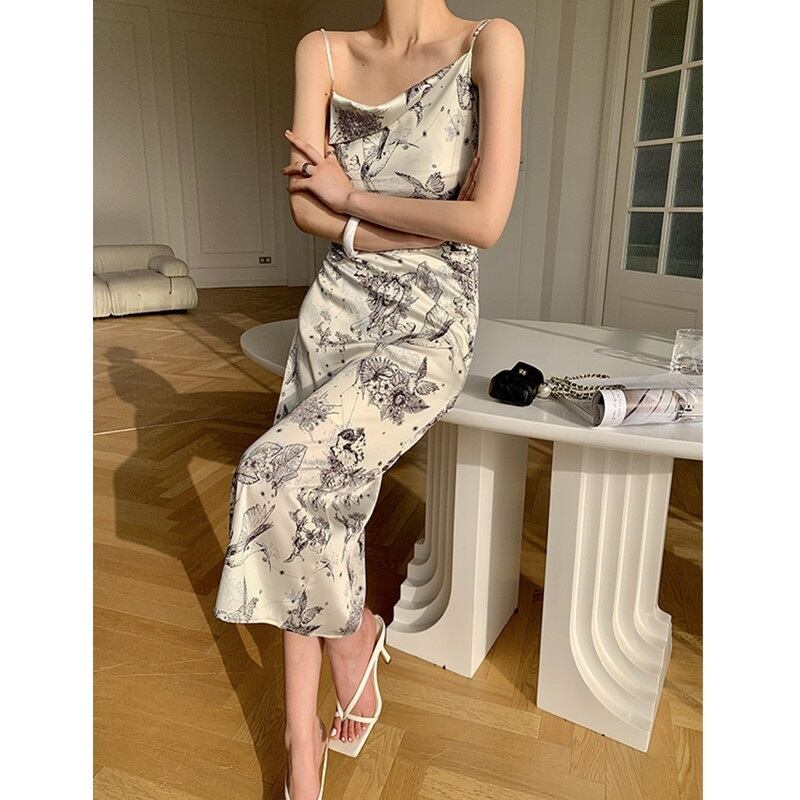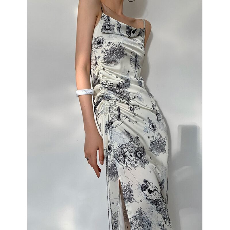 フランスのレトロな気質の女性らしさセクシーなスイングカラーサスペンダードレススリムフィットと薄いスリットサスペンダードレス女性の夏 サマー 夏物 yingd87615530706