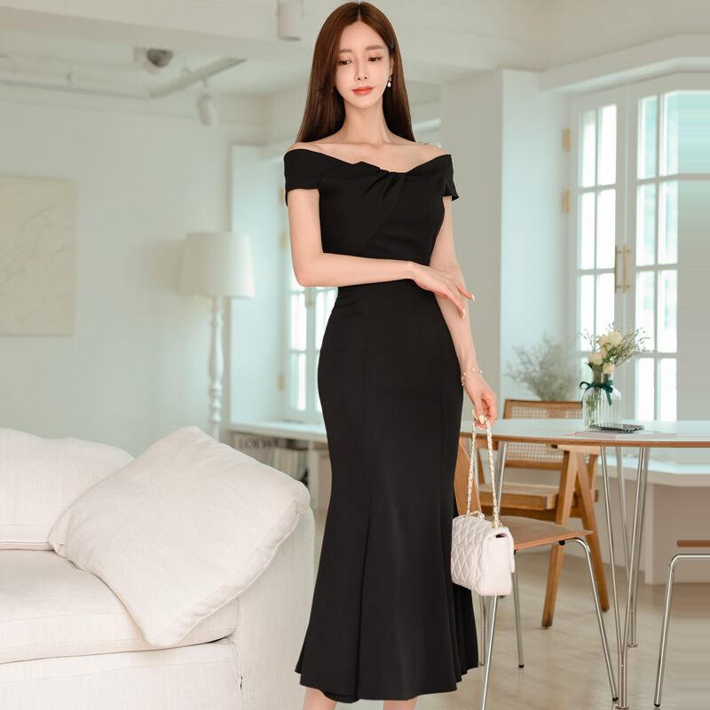 フランスのレトロなヘップバーンスタイルのニッチな膝丈のドレスシックなデザインのウエスト高精細フィッシュテールドレス女性の夏 サマー 夏物 yingd81831174374