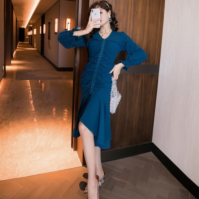フランスのニッチなウエストと細い気質Vネックの軽いおなじみのスタイルのフィッシュテール長袖ドレス2020年秋新しい女性 ロング オータム 秋物 yingd45974127556