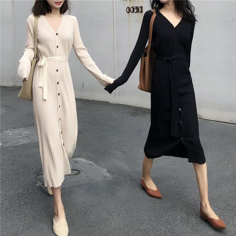 2020年秋新作レディースフレンチレトロニッチウエストとスリム気質シングルブレスト長袖ニットワンピース ロング オータム 秋物 yingd55905580853