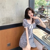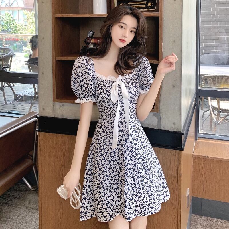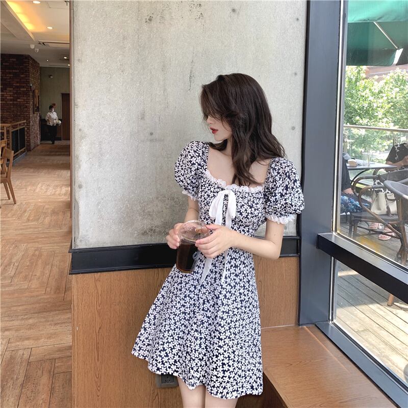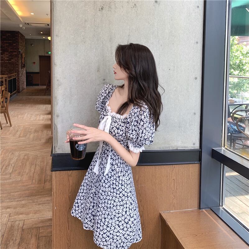 スカート2020新しい夏フランスのレトロな小さな男のウエストと薄い気質のスクエアネック花柄のドレスの女性 サマー 夏物 スクウェア yingd24684389467