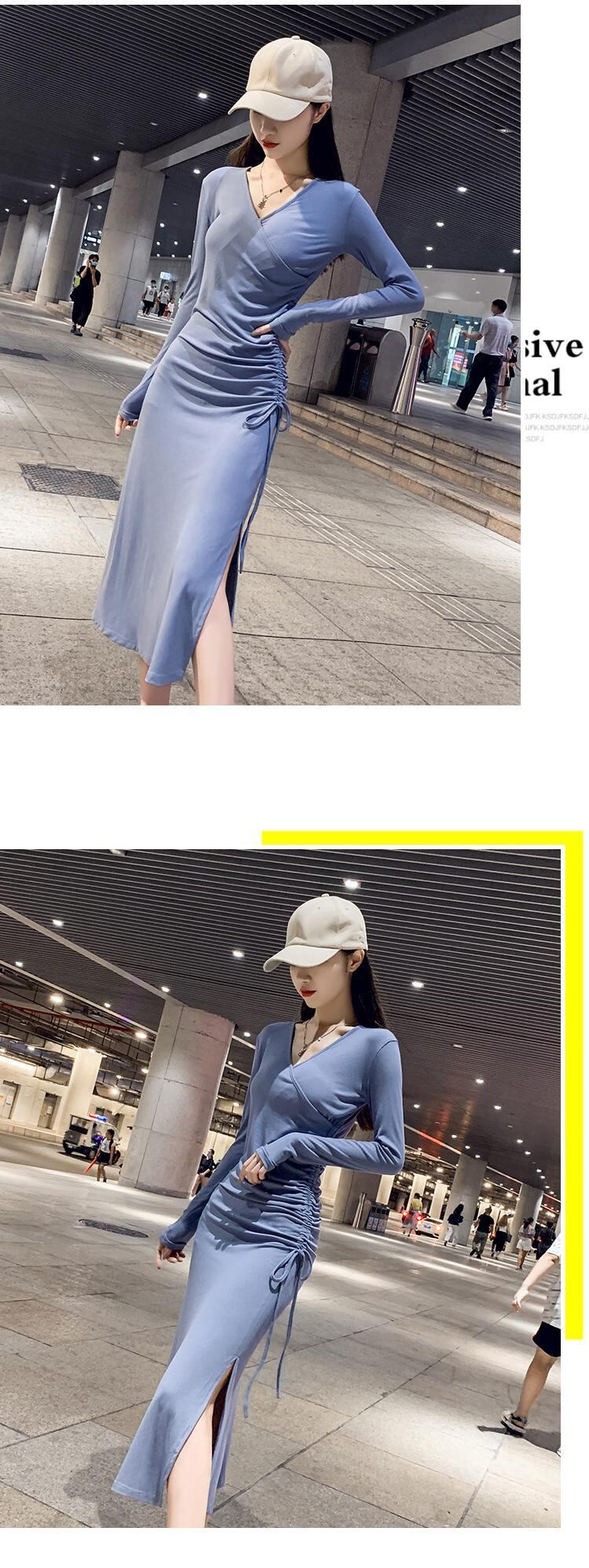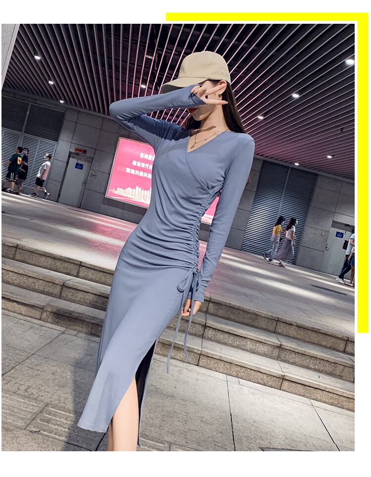 2020年秋新しい女性のウエストと細い気質Vネックスリットセクシーなドレス女性のヘップバーンスタイルのリトルブラックドレス オータム 秋物 yingd48475052901