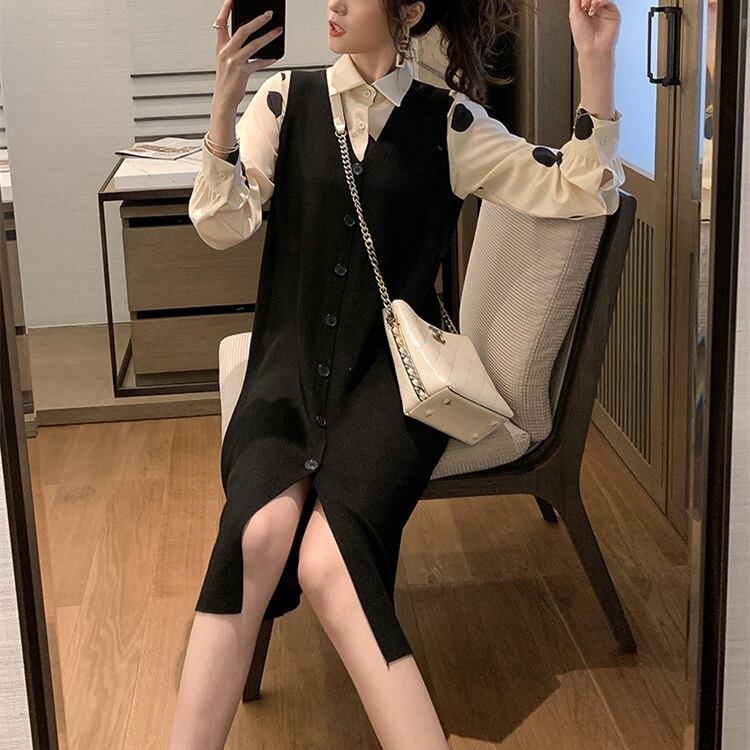 ニットドレススーツ女性2019年秋新作フレンチレトロ気質水玉シフォンシャツツーピースタイド オータム 秋物 yingd97259057682