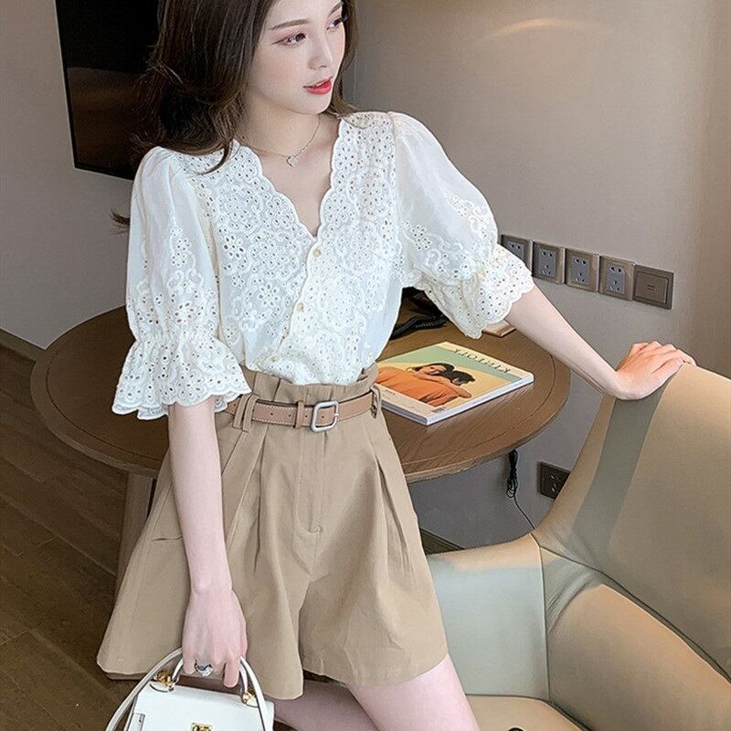 フランスのレトロなヘップバーンスタイルは、塩辛くて甘い小さなスーツの女性の中空トップワイドレッグショーツウエスタンスタイルのツーピーススーツにすることができます 大人ガーリー スウィート キュート カジュアル ブルマー yingd10109017600
