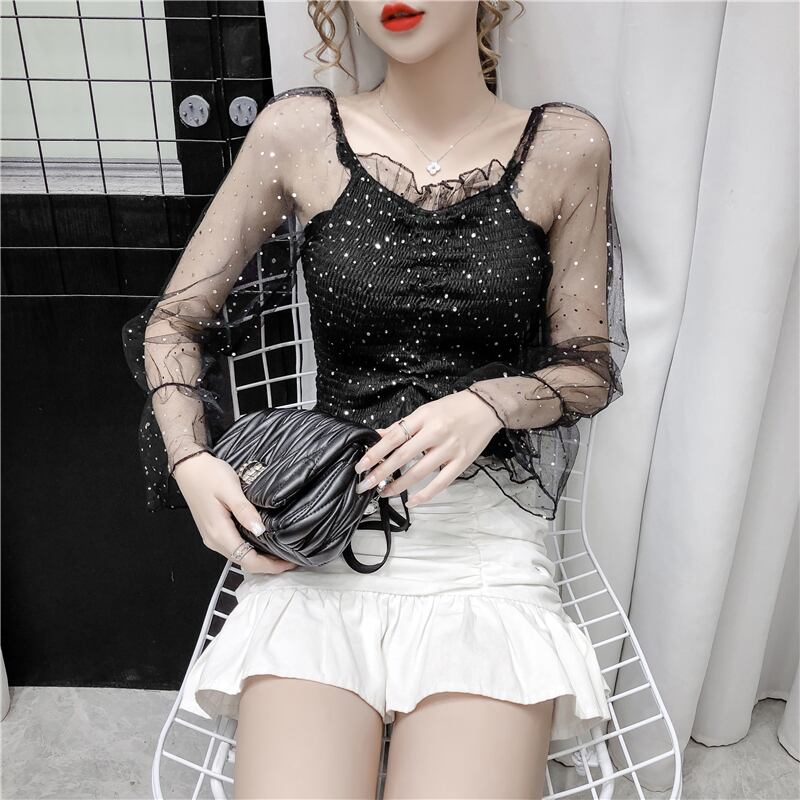 2020年秋新作レトロ香港風味長袖セクシーメッシュトップレディースデザインセンススモールウエストウエストスモールシャツ ロング レッド オータム 秋物 yingd36743391119