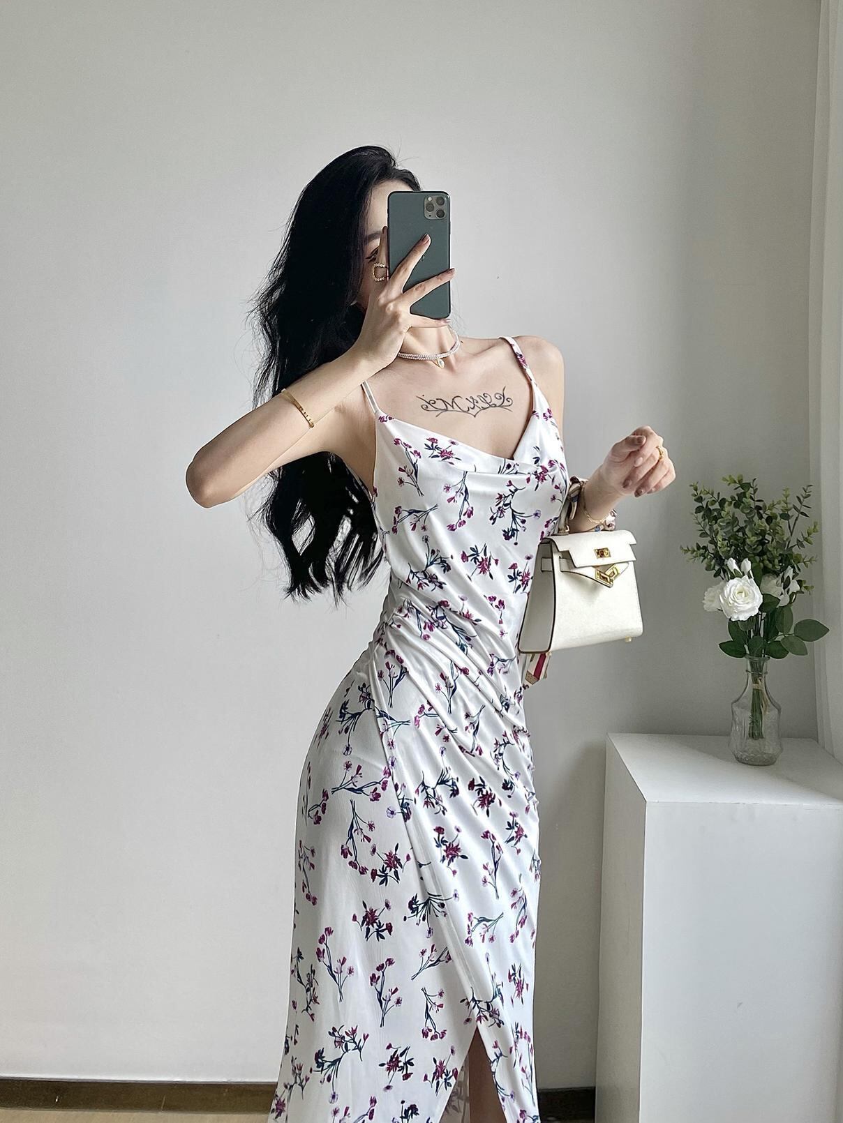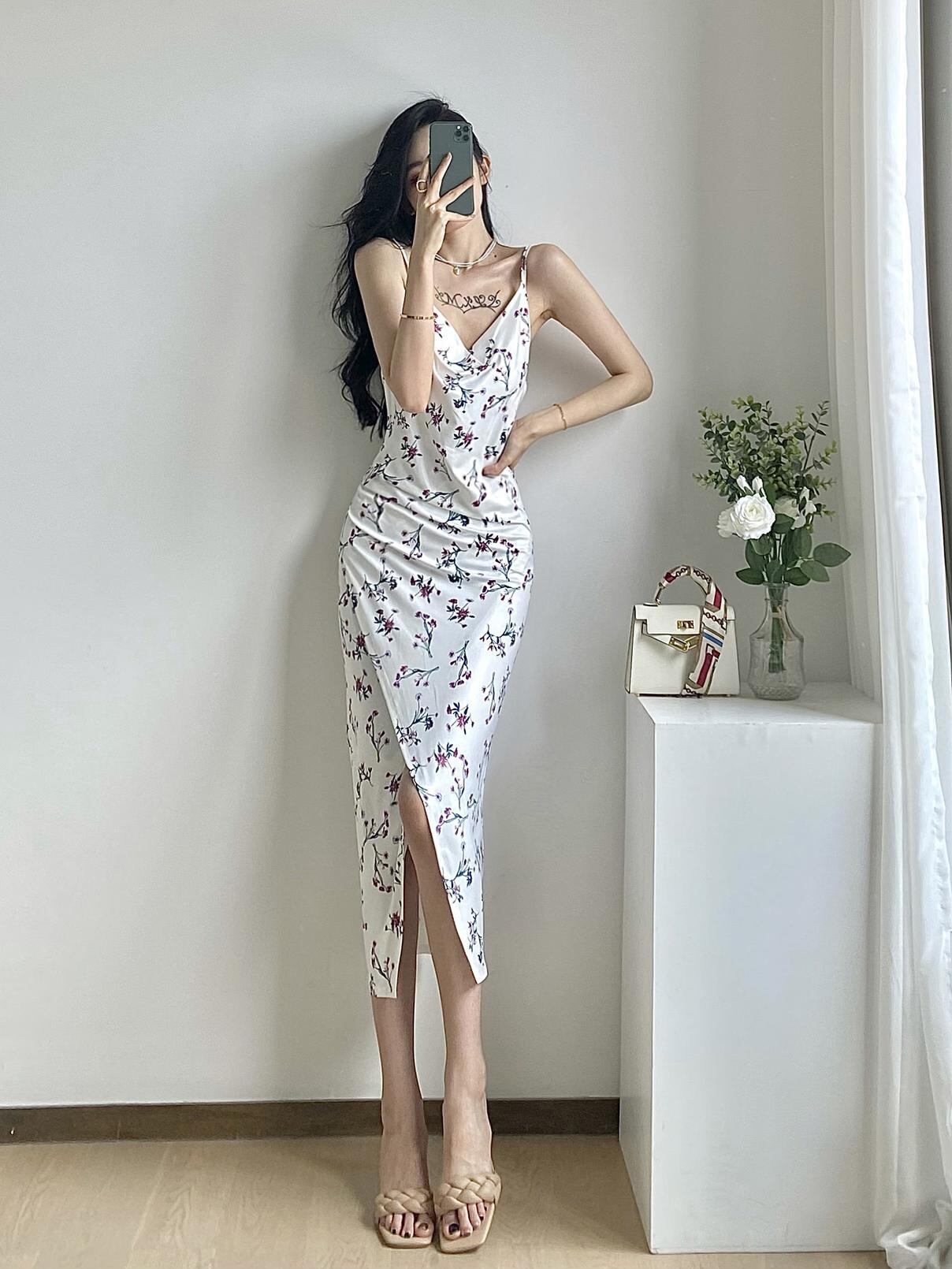 フレンチレトロライトおなじみスタイルスプリットサスペンダーロングスカート気質女性らしさセクシーフローラルスイングカラーサスペンダードレス夏 サマー 夏物 花柄 yingd7817622966