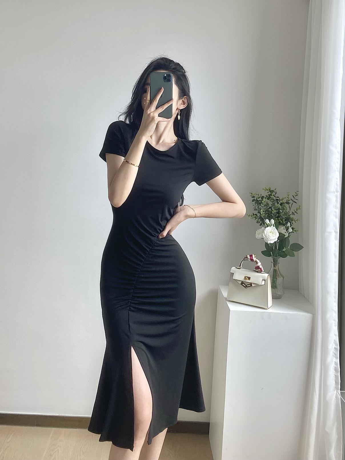 フランスのレトロなヘップバーンスタイルのリトルブラックドレススリムフィットとスリムな気質セクシーなパッケージヒップデザインプリーツドレス女性の夏 サマー 夏物 yingd88452642096