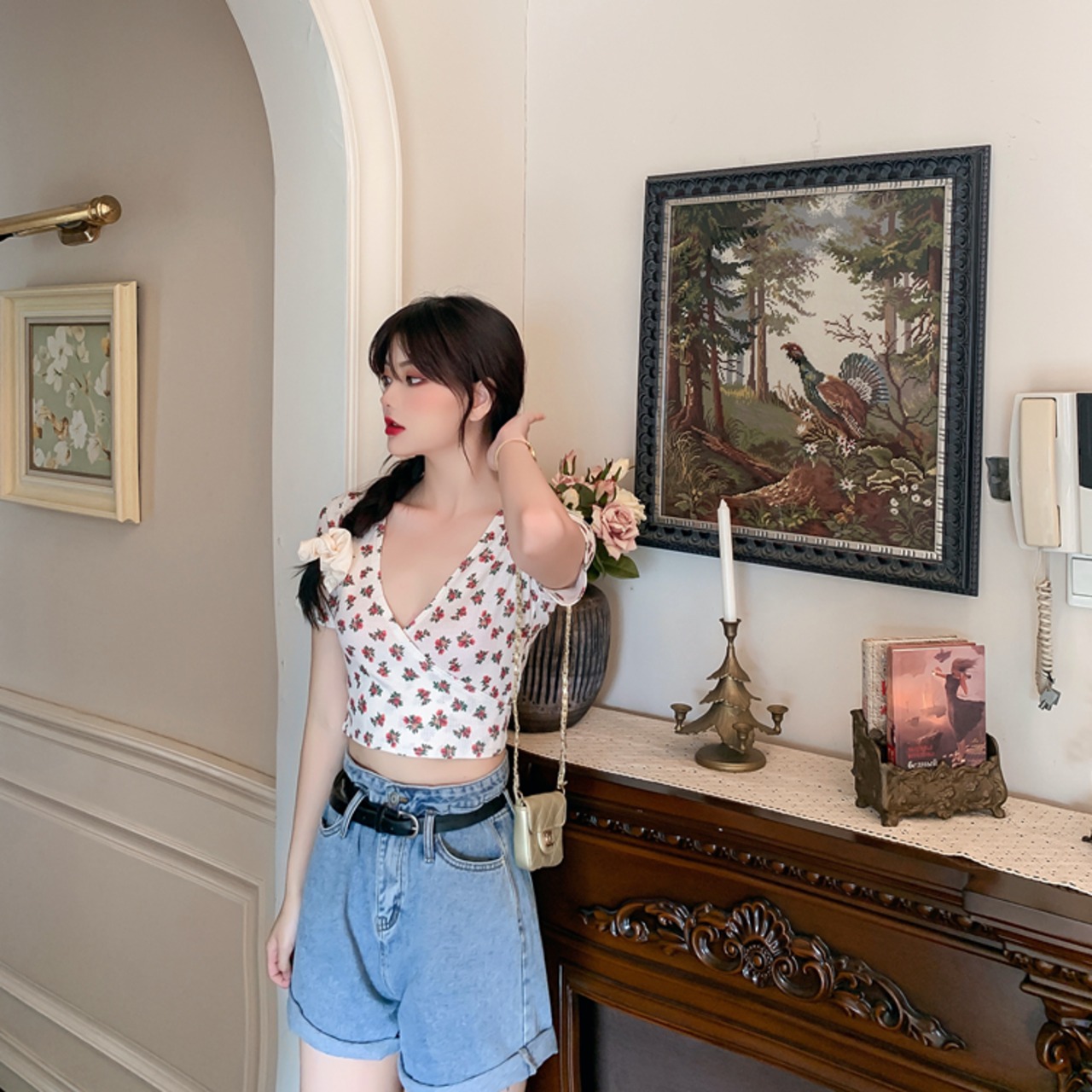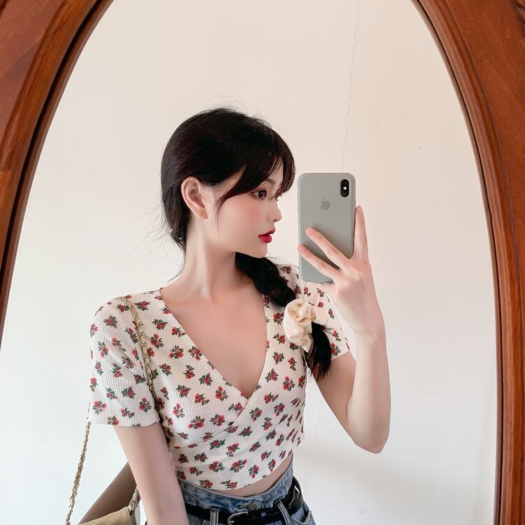 機械に注意してくださいショートトップ女性の2020年夏の新しいフレンチレトロ香港フレーバーVネックデザインセンス半袖Tシャツ女性 サマー 夏物 yingd34033185801